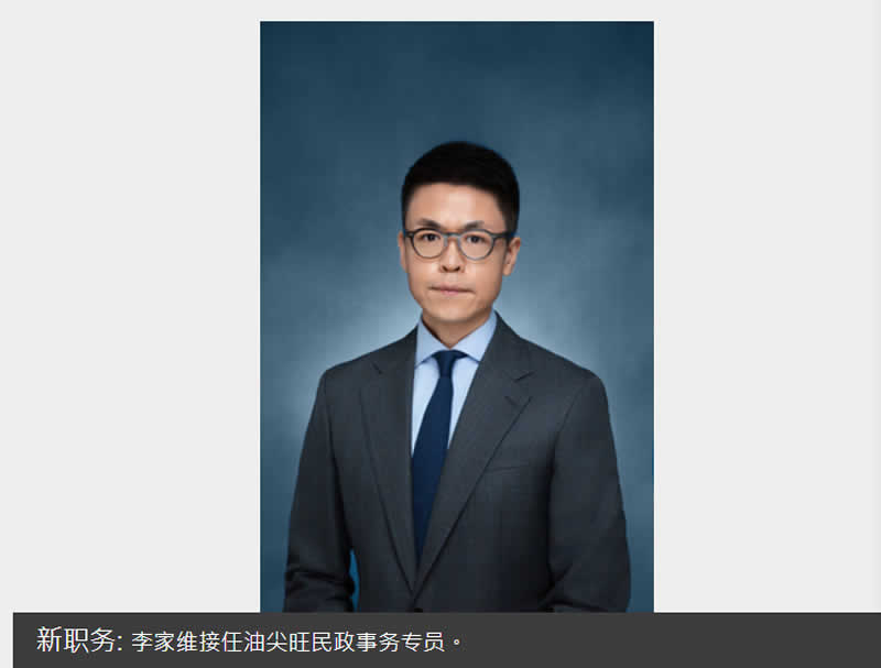 政府公布,财经事务及库务局首席助理秘书长(财经事务)李家维明日接替余健强出任油尖旺民政事务专员。