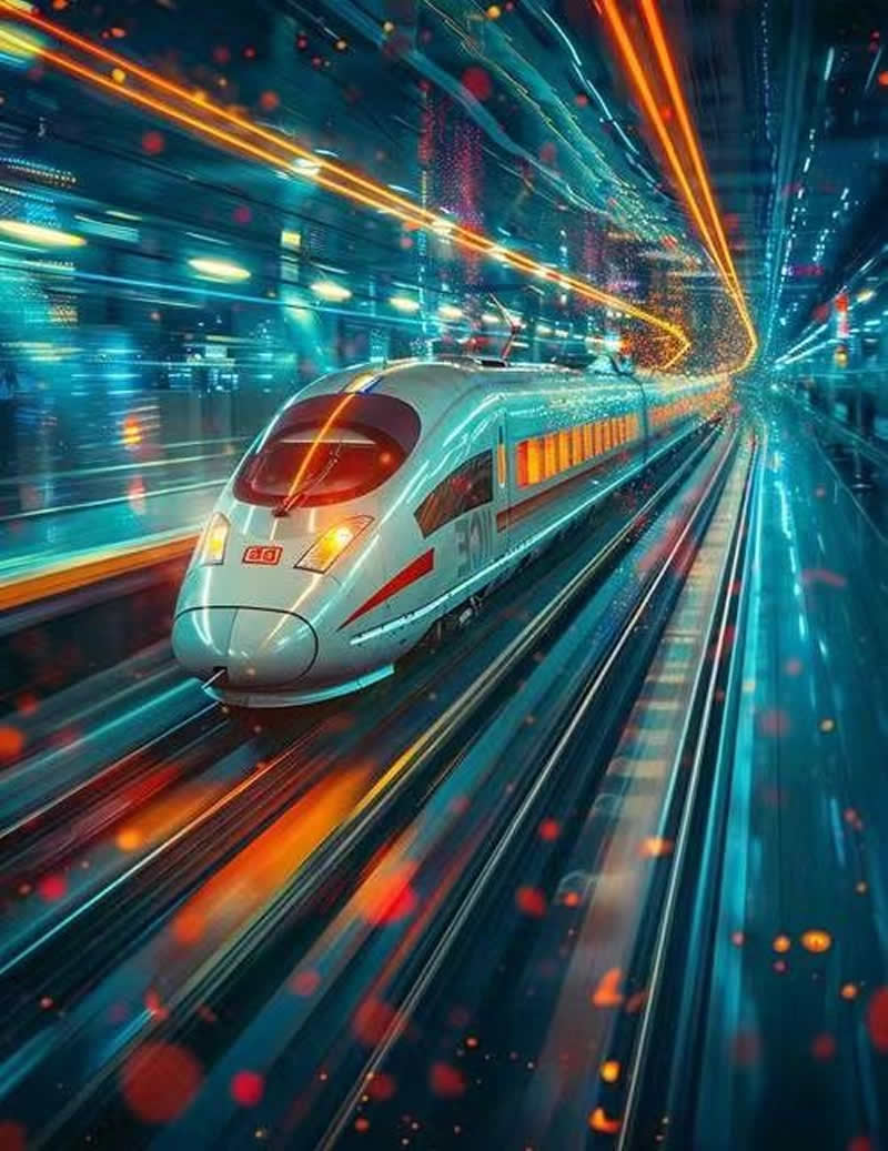 高鐵靜駐於站台,夜幕為它披上流光的衣。車窗透出暖黃燈火。