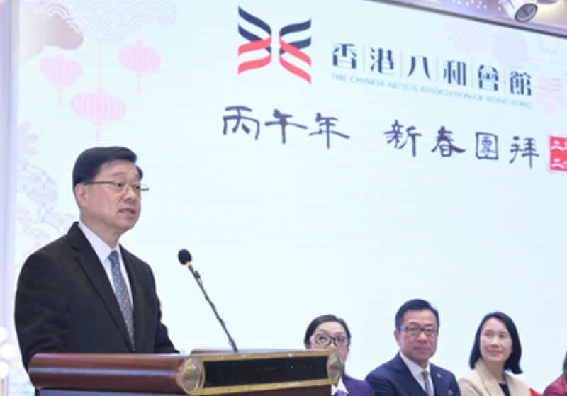 行政长官李家超(左)2月26日在香港八和会馆丙午年新春团拜致辞时说,粵剧是香港的世界级非物质文化遗产。政府支持粵剧发展,希望粤剧界创作更多优秀作品,为中华文化发展和传承贡献力量。