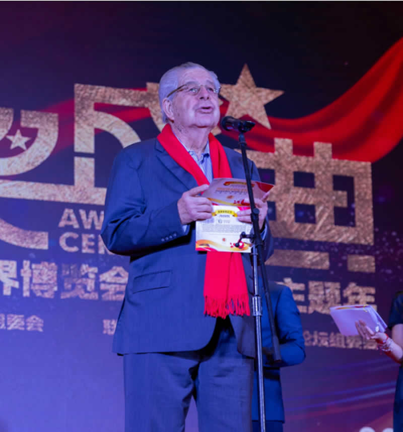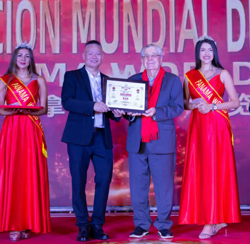↑巴拿马前副总统阿图罗·尤利西斯·瓦拉里诺·巴图亚诺亲自为百草饮颁发金奖